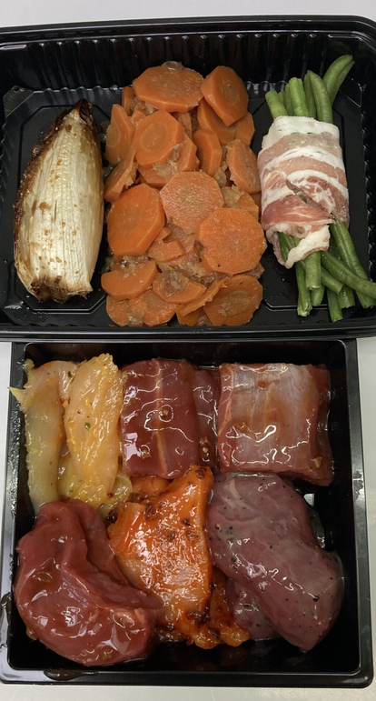 Vlees: Hert, lams, kangoeroe, steak, varkenshaasje, kalkoen, kip.